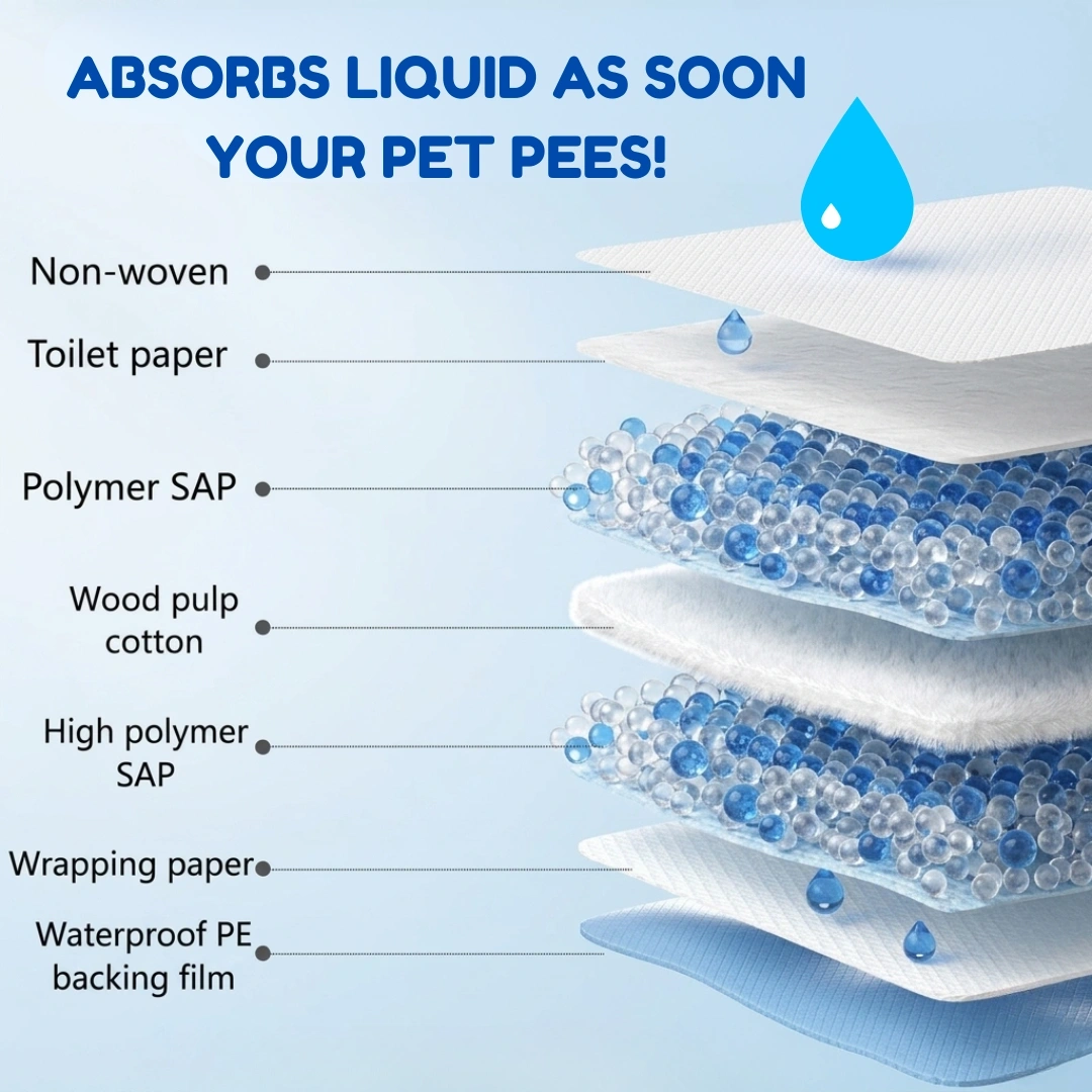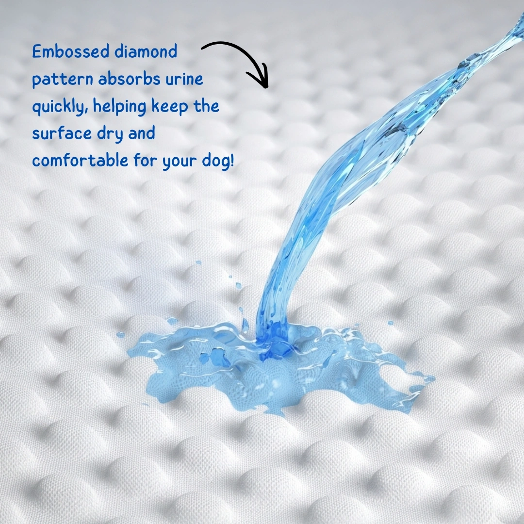 Designed with an embossed diamond (rhombic) pattern and an upgraded 7-layer structure, these pee pads absorb urine quickly and lock in moisture, keeping the surface dry and your pet comfortable.
