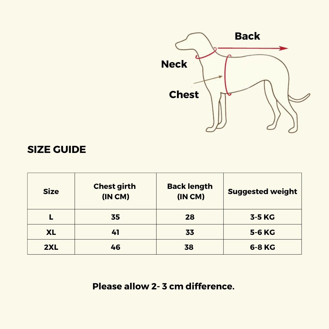 Measure your dog’s chest girth and back length before ordering.